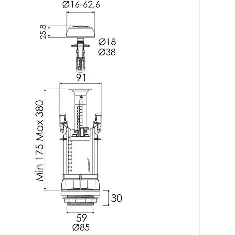 Rattrapage de l’axe réservoir couvercle, pas de recoupe du trop-plein, réglage télescopique, bouton chromé.