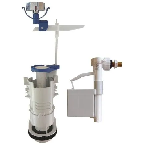 Mécanisme NF universel SIMPLEX à poussoir simple débit, Montage simple et rapide, S’adapte par simple réglage de l’étrier à la plupart des réservoirs de 300 à 470 mm de hauteur interne Rattrapage de l’axe réservoir couvercle, Pas de recoupe du trop-plein, Réglage télescopique, bouton chromé, Passage dans couvercle de 16 à 42 mm.