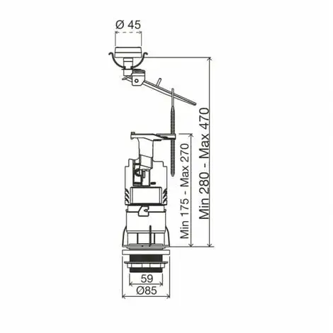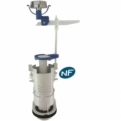 Mécanisme NF universel SIMPLEX à poussoir simple débit, Montage simple et rapide, S’adapte par simple réglage de l’étrier à la plupart des réservoirs de 300 à 470 mm de hauteur interne Rattrapage de l’axe réservoir couvercle, Pas de recoupe du trop-plein, Réglage télescopique, bouton chromé,passage dans couvercle de 16 à 42 mm.