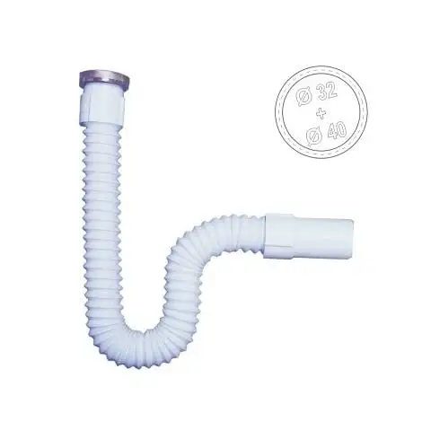 Siphon extensible gardant la forme, disponible en Ø 32 avec un raccord mâle et un raccord à écrou prisonnier thermo-soudés. Longueur 300 à 600 mm