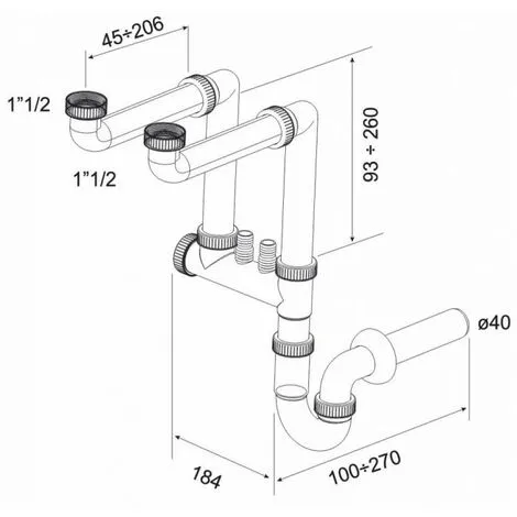 Siphon pour 2 éviers, sans bonde, sortie diamètre 40mm avec 2 raccordements machine à laver.