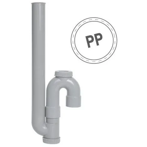 Siphon de machine à laver simple en Polypropylène, Sortie verticale directe en PVC Ø 40, Résistant à une température de 110 °, avec 2 bouchons de dégorgement permettant le nettoyage du siphon. Sortie orientable, collage sur PVC